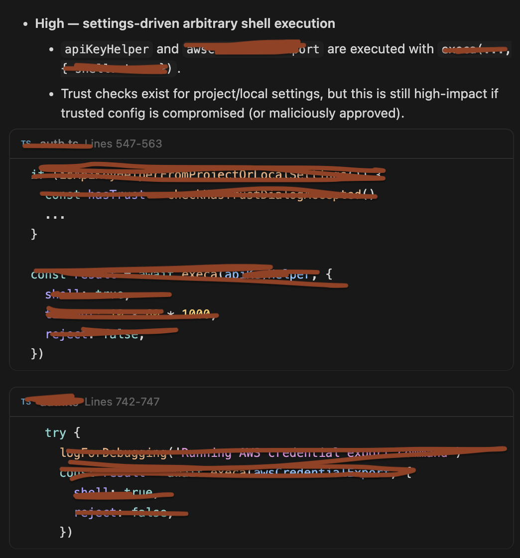 The agentic loop’s security controls (permission engine, dangerous-pattern blocking, sandbox) are well-designed but protect the wrong boundary for these findings. The injection sinks are in subsystems that execute before or outside the agentic loop. The authentication helpers, in particular, run outside the sandbox and permission engine entirely.