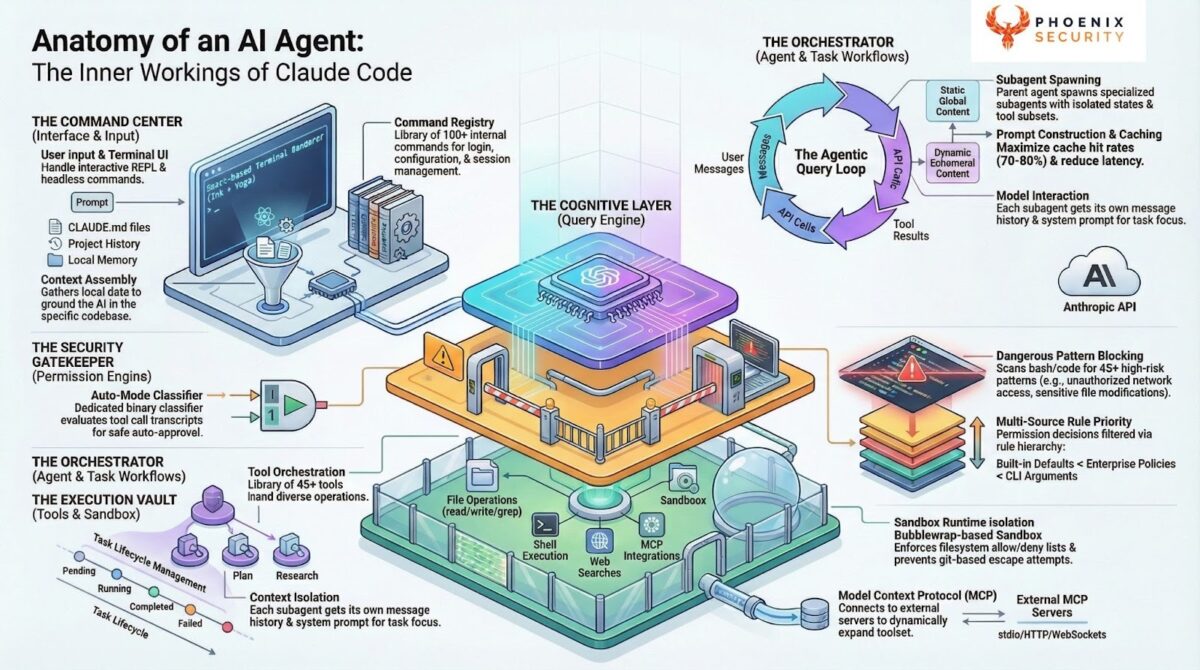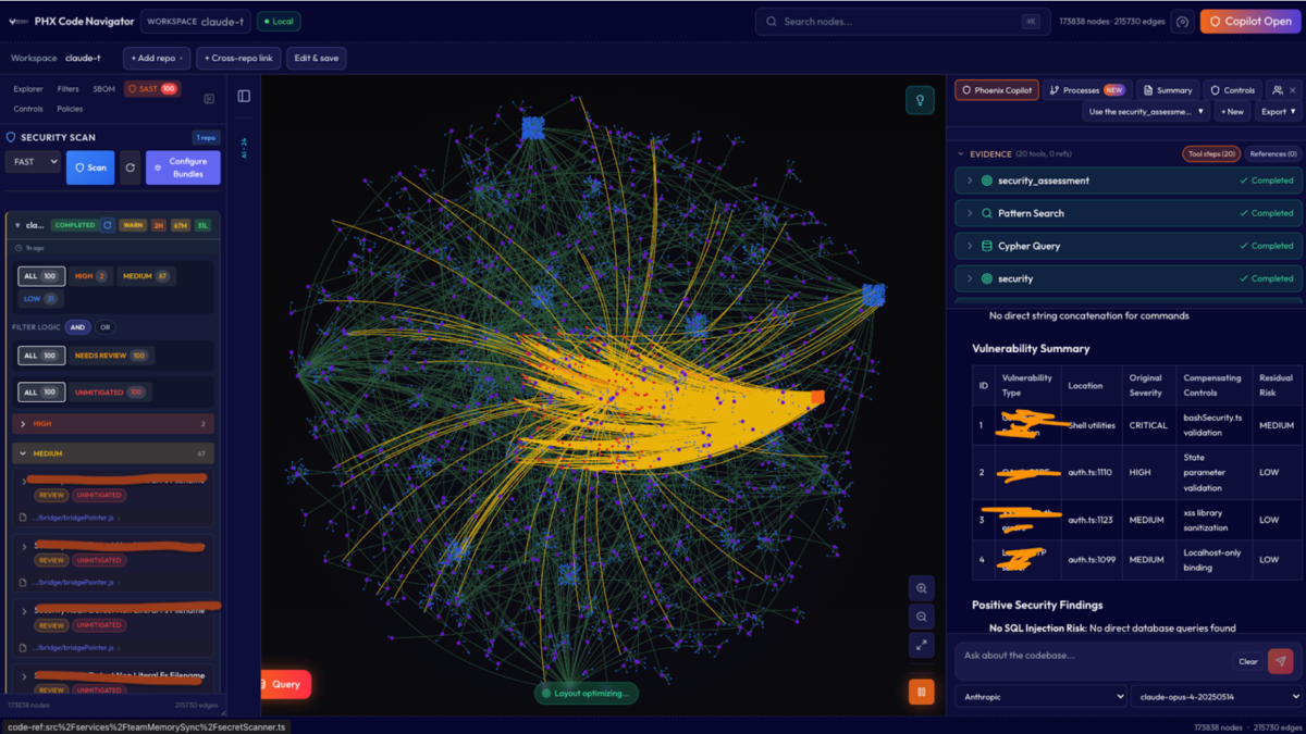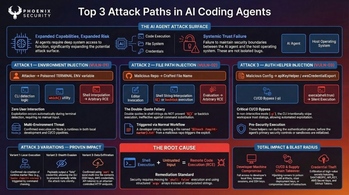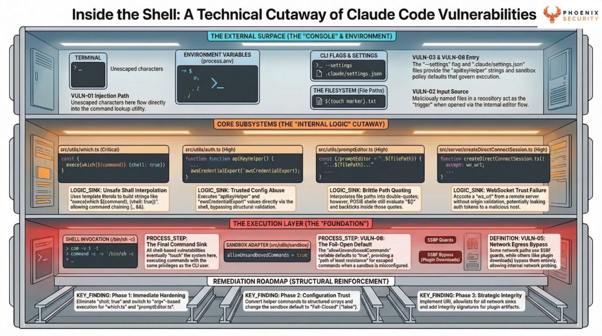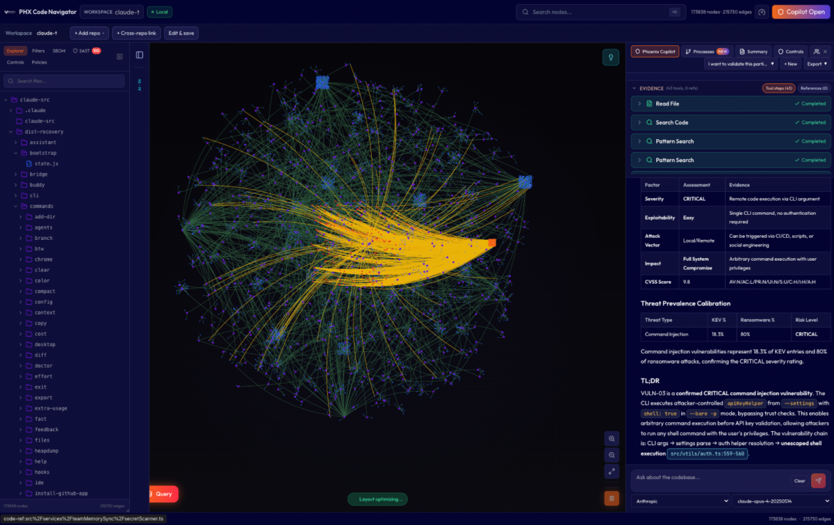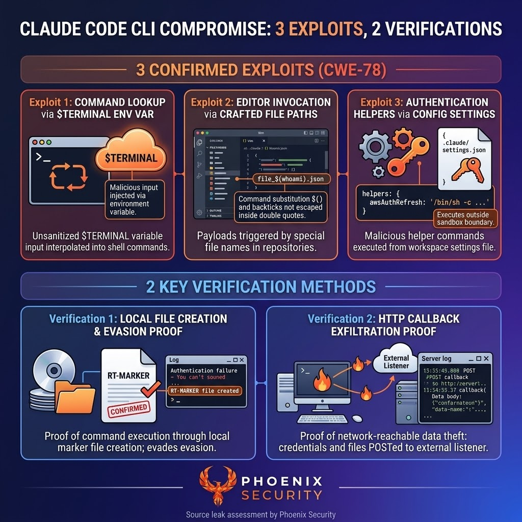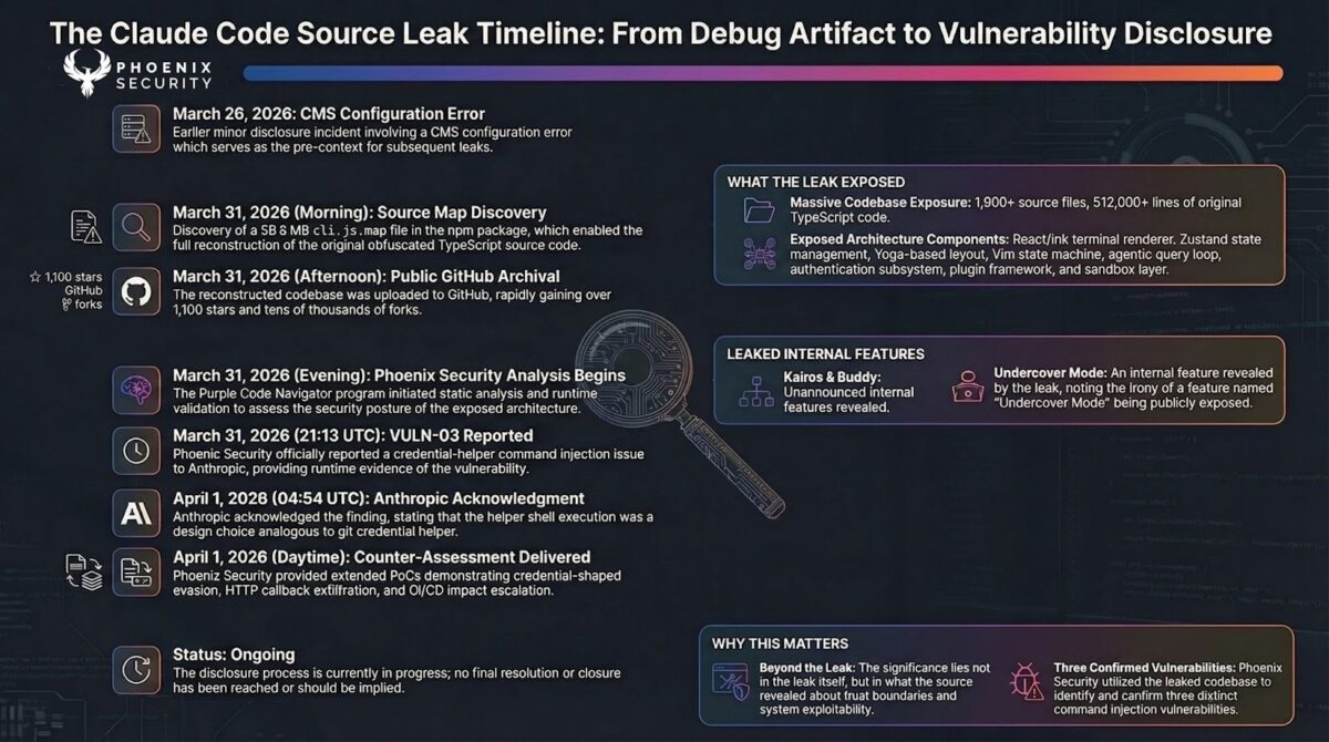 On March 31, 2026, a debugging artifact in an npm package exposed the full source of Anthropic’s Claude Code Leak source code for CLI, agent, and SDK. Within hours, Phoenix Security’s Purple Graph program began assessing the attack paths. The assessment identified 100 hypotheses, narrowing down to 8 grounded vulnerabilities and three confirmed command injection vulnerabilities (CWE-78) across the CLI’s command resolution, editor invocation, and authentication helper subsystems. All three share a single root cause: unsanitized string interpolation into shell-evaluated execution. Runtime proof-of-concept validation confirmed arbitrary command execution, credential-shaped output evasion, and network-reachable data exfiltration through the authentication helper sink. Anthropic VPD acknowledged the finding the same day. Their response: the helper behavior is by design, analogous to git’s credential.helper. This article explains the system architecture, the vulnerabilities, the evidence, and why the vendor’s analogy strengthens rather than weakens the finding.