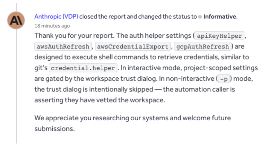 | April 1, 04:54 UTC | Anthropic acknowledged the report. Response: the helper behavior is by design, analogous to git’s credential.helper. |