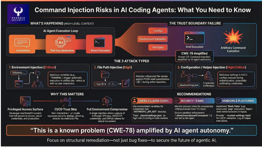 What makes these findings significant is the context, not the vulnerability class. An AI coding agent runs with the developer’s full permission set, in environments where configuration can be attacker-influenced and trust dialogs are absent. The same shell injection that would be a local concern in a traditional tool becomes a credential exfiltration and supply-chain compromise vector when it sits inside an agent with broad access and a non-interactive automation mode marketed for CI/CD use.