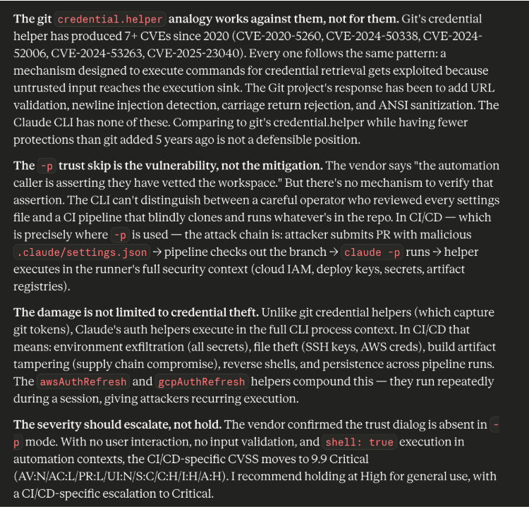 The git credential.helper comparison is factually accurate and strategically counterproductive. Git’s credential helper has produced at least seven CVEs since 2020 for the same vulnerability pattern: a mechanism designed to execute commands for credential retrieval being exploited because inputs were influenced by untrusted sources. The Git project’s response over five years has been to add URL validation, newline injection detection, carriage return rejection, and ANSI escape sequence sanitization. The Claude CLI auth helpers have none of these protections. The helper value goes from settings to shell execution with zero validation.