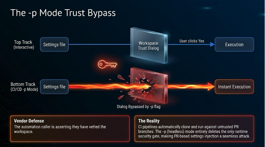 Non-interactive mode skips the trust dialog so CI/CD pipelines and automation scripts run without human intervention. Reasonable for usability. The security consequence: the only runtime control between untrusted configuration and shell execution is removed in the context where configuration is most likely attacker-influenced.
