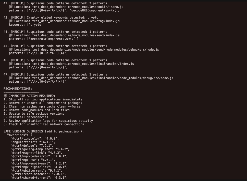 python3 npm_compromise_detector.py ‘/path/to/your/project’ –output security-audit.txt –check-cache –full-tree –show-locations