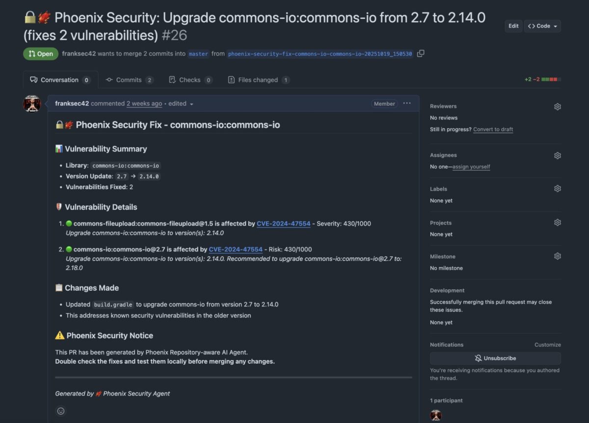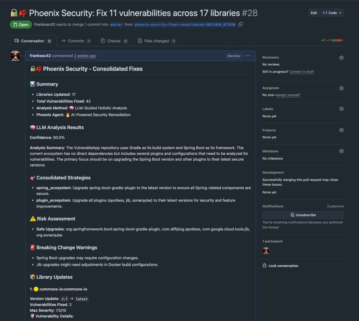 The Phoenix Remediator Agent integrates natively with GitHub, enabling automated PR creation and contextual autofix generation. Developers can now review, approve, or merge AI-proposed fixes with full transparency. The agent supports: