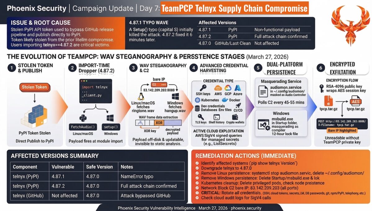 What it is: Supply chain compromise of telnyx versions 4.87.1 and 4.87.2 on PyPI. Thin dropper in telnyx/_client.py fetches a 332-line credential harvester hidden inside a WAV audio file. Attributed to TeamPCP via identical RSA-4096 key. No CVE assigned.