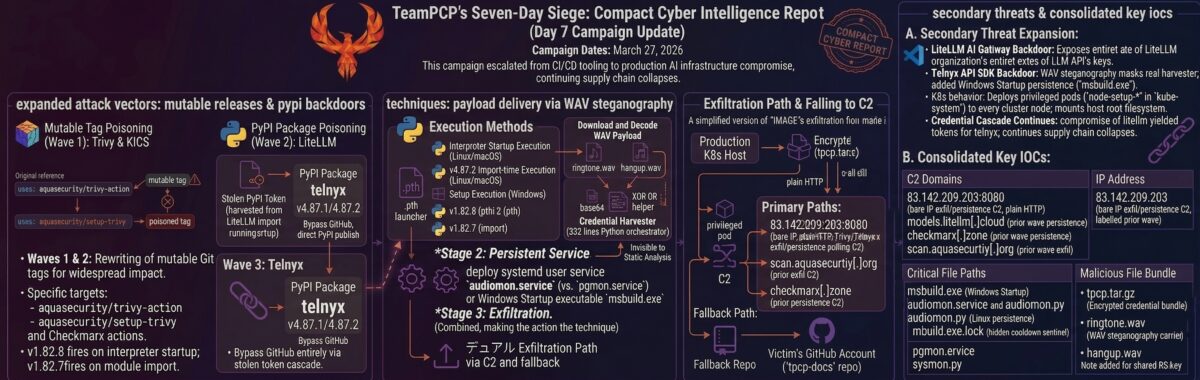 On March 27, 2026 — seven days into the most consequential software supply chain campaign on record — TeamPCP struck again. The threat actor, also tracked as DeadCatx3, PCPcat, and ShellForce, published two backdoored versions of telnyx to PyPI without corresponding GitHub releases or tags. Telnyx is a telecommunications API SDK with approximately 742,000–790,000 monthly downloads; its SDK handles telephony credentials, session tokens, and API keys by design, making it a high-value target with maximum credential density per compromised host.