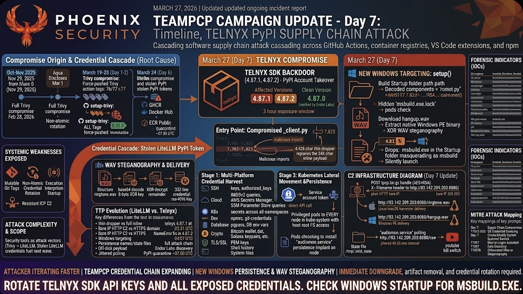 The telnyx payload shares the byte-for-byte identical RSA-4096 public key as the litellm compromise three days earlier, providing unambiguous attribution to TeamPCP. But the attacker has not stood still. Every major delivery and evasion mechanism has been redesigned: the 34,000-character inline payload from litellm is replaced by a 4,428-character thin dropper; the real 332-line credential harvester is now hidden inside a WAV audio file, fetched at runtime from a bare IP-address C2 server, invisible to static analysis. Windows targeting — absent from every prior TeamPCP campaign wave — appears for the first time, with a native binary extracted from a second WAV file and installed in the Startup folder masquerading as msbuild.exe.