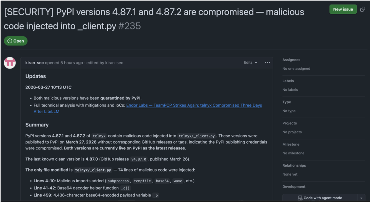 The credential chain driving these attacks is propagating. TeamPCP’s March 24 litellm compromise harvested PyPI publishing tokens from thousands of CI/CD pipelines that import LiteLLM. Three days later, one of those stolen tokens enabled direct publication to telnyx’s PyPI account, bypassing GitHub entirely. Each compromised package produces credentials that unlock the next target. PyPI quarantined both malicious versions within approximately three hours of discovery by Endor Labs. Version 4.87.0, published March 26, is the last known-clean release.